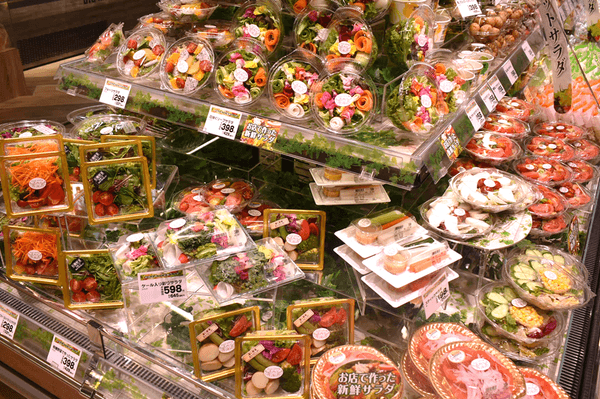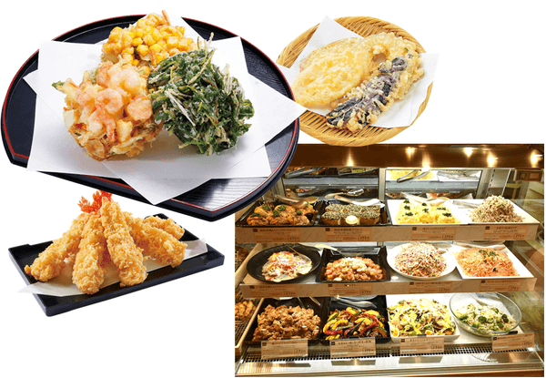 旬の食材や国産の野菜を店内で衣付けし、キャノーラオリーブ油でカラッと揚げた天ぷらを対面で販売いたします。その隣には好きな量を購入できる量り売りのサラダコーナーも設置いたします。