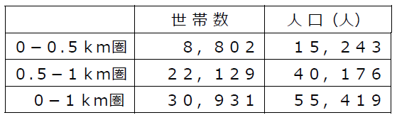 ・店舗から1㎞圏内は単身世帯比率が54.0%、2人世帯比率が22.3%と全体の8割弱が少人数世帯です。