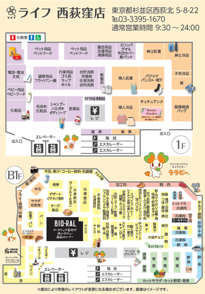 荻窪周辺は世帯数・人口ともに増加傾向にあり、JR中央線の各駅を起点とした路線バスが多数運行する地域です。地下1階に食品、地上1階に食品以外の生活用品を幅広く取りそろえ、ワンストップショッピングを実現いたします。食品フロアではライブ感のある魚・惣菜の対面売り場をはじめ、ライフ最大級の冷凍食品売り場、ニーズが高まっている健康へのこだわりが詰まった商品などを豊富に品ぞろえいたします。生活用品フロアではベビー用品・ペット用品・コスメ・衣料品などを中心に幅広くご用意することで、地域のお客様の生活に寄り添います。