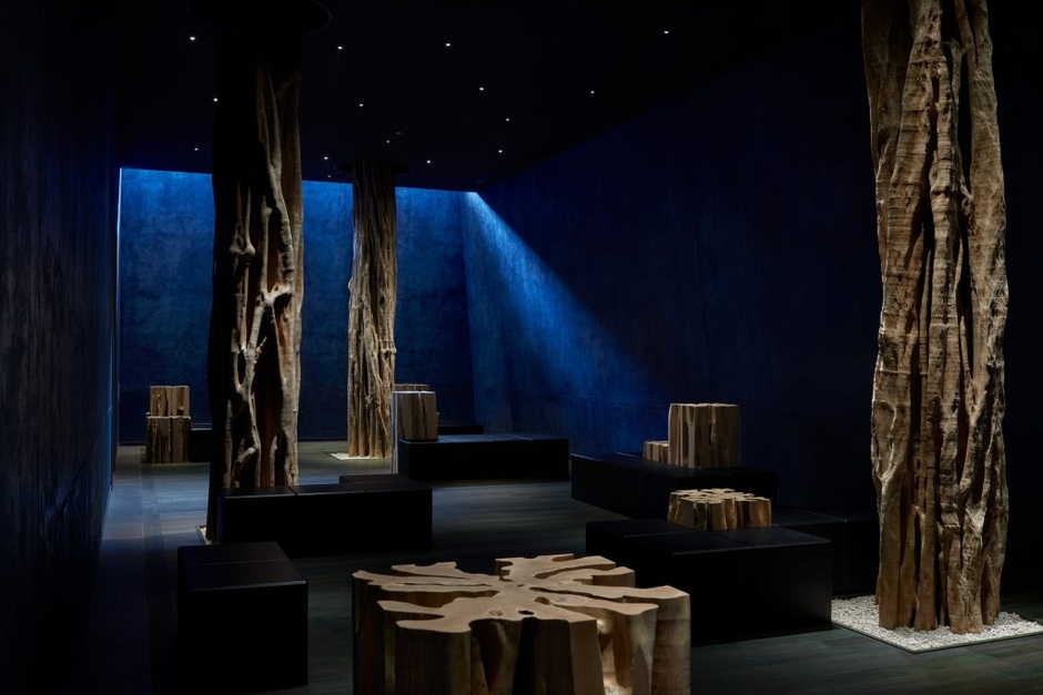 非日常への入口となるレセプション。星のや沖縄のレセプションは、深海のようにデザインされています。「長い距離を移動して辿り着く場所は、気持ちをハッとさせたい」と語る、照明設計家 武石氏。深海のような、光の入らない深いブルーを基調に、舞台セットのようなレセプションが誕生しました。