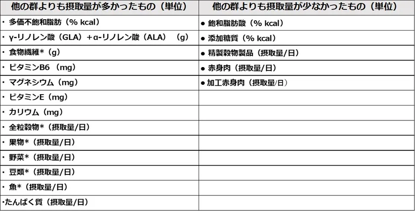 (2) くるみ摂取者は、他のナッツ類の摂取者やナッツ類非摂取者と比べて自己申告による以下の一日の摂取量が多かった。なかでも「米国人のための食生活指針(2015-2020 Dietary Guidelines for Americans)」(※7*)にまとめられている摂取量の少ない栄養素や公衆衛生上重要な食品群の摂取量が有意に多かった。