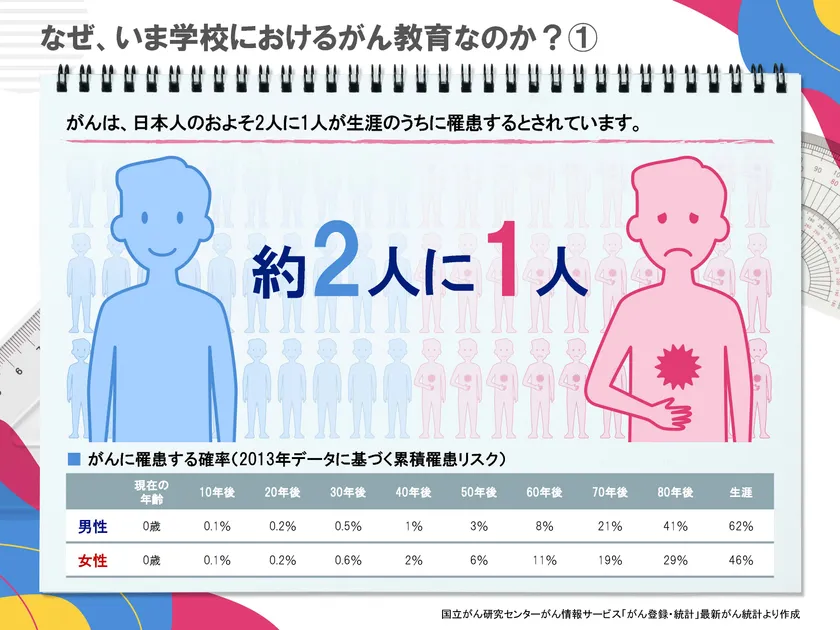 現在、日本人のおよそ2人に1人が生涯のうちに“がん”に罹患する(*1)とされており、こうした現状を踏まえ、学習指導要領改訂で「がん教育」が明記され、2020年度以降、小学校・中学校・高等学校において、健康教育の一環として「がん教育」の授業が始まっています(*2)。