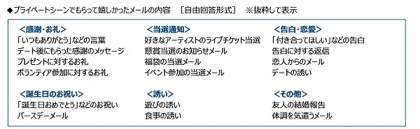 【プライベートシーンでもらって嬉しかったメールの内容】をみると、<感謝・お礼>では「『いつもありがとう』などの言葉」や「デート後にもらった感謝のメッセージ」、「プレゼントに対するお礼」、<誕生日のお祝い>では「『誕生日おめでとう』などのお祝い」、<当選通知>では「好きなアーティストのライブチケット当選」、<誘い>では「遊びの誘い」や「食事の誘い」、<告白・恋愛>では「『付き合ってほしい』などの告白」といった回答がありました。