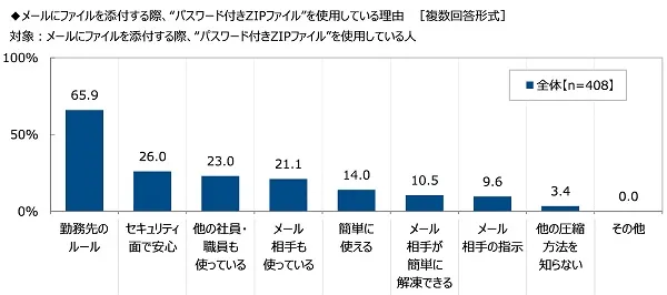 メールにファイルを添付する際、“パスワード付きZIPファイル”を使用している人(408名)に、“パスワード付きZIPファイル”を使用している理由を聞いたところ、「勤務先のルール」(65.9%)が突出して高くなりました。次いで高くなったのは、「セキュリティ面で安心」(26.0%)、「他の社員・職員も使っている」(23.0%)、「メール相手も使っている」(21.1%)、「簡単に使える」(14.0%)でした。