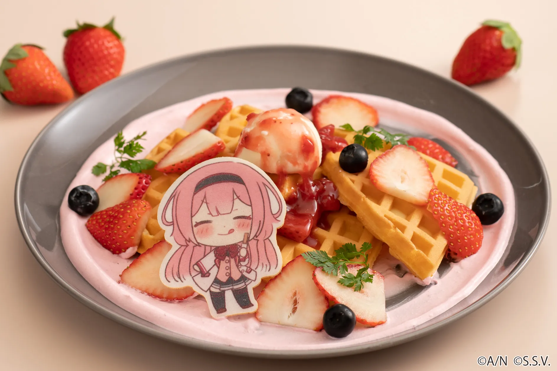 ・「周央サンゴのたっぷり苺ワッフルプレート」:1,600円(カフェ「ミ カサ」)