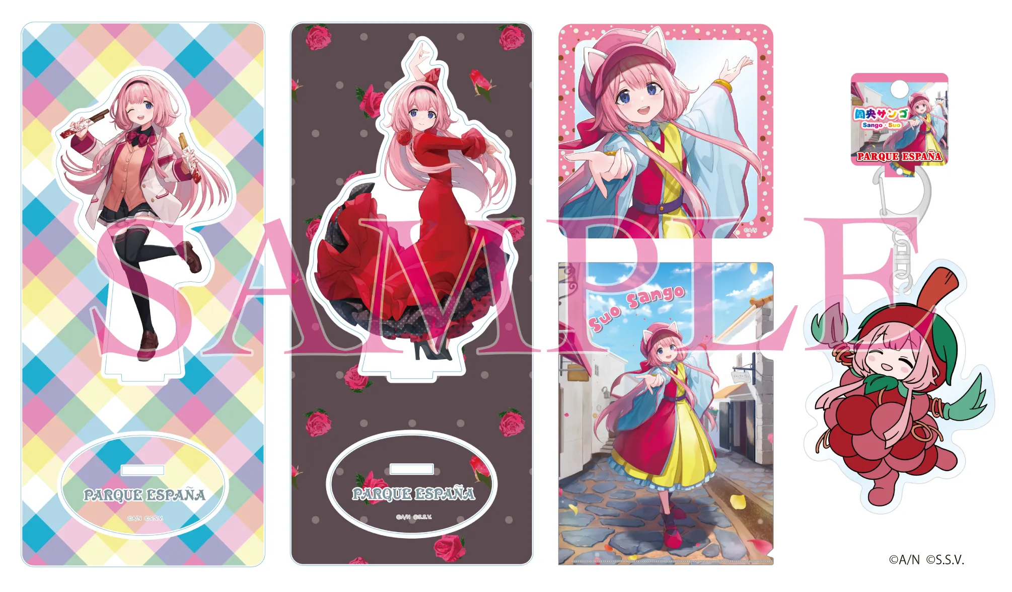 コラボ記念オリジナル描き下ろしイラストをあしらったグッズを、園内ショップ「アスタ ラ ビスタ」にて販売します。志摩スペイン村のチュロスを持った周央さんのアクリルスタンドや、志摩スペイン村のキャラクター“ダルシネア”とお揃いの衣裳を身にまとったイラストのクリアファイルなど、ここでしか手に入らないグッズばかりです。