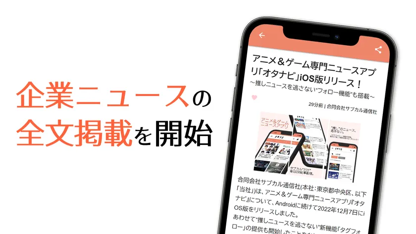 合同会社サブカル通信社(本社:東京都中央区、以下「当社」)は、アニメ&ゲーム専門ニュースアプリ『オタナビ』について、2022年12月24日(土)より一部記事の全文掲載を開始し、掲載コンテンツを大幅増加いたしました。