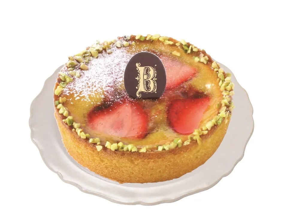 ピスタチオペーストの風味豊かな生地に苺のコンフィチュールと苺のスライスをのせて焼き上げました。