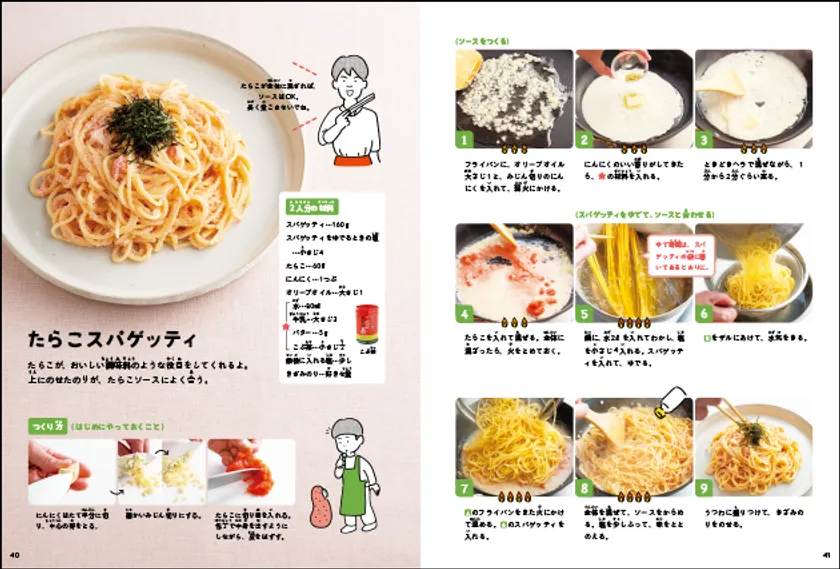 1品を見開き2ページで紹介。すべての漢字にふりがなつき(たらこスパゲッティ)