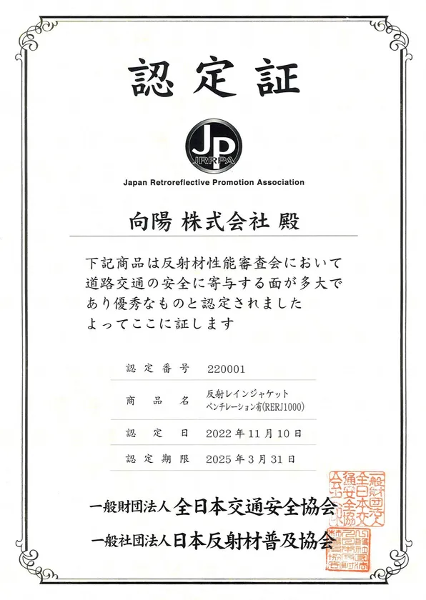 レインウェアの製造を行う向陽株式会社(所在地:兵庫県西区、代表取締役:安本 巌)は、命を守る「全面反射レインウェア TAPETUM(タペタム)」が一般財団法人 全日本交通安全協会、一般社団法人日本反射材普及協会の反射性能審査会において道路交通の安全に寄与する面が多大であり優秀なものとしてJPマーク認定されたことを発表します。