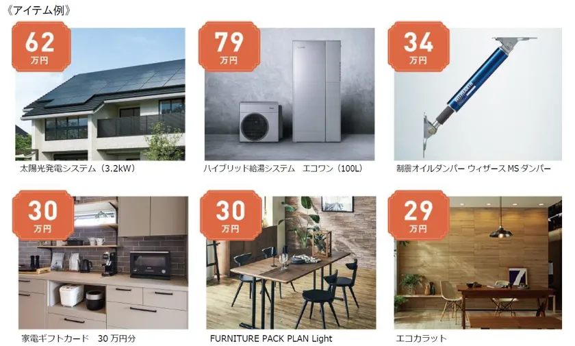 フェア期間中にご成約すると、先着200名のお客様に、太陽光発電システムやシステムキッチンをはじめ、ウィザースホームが厳選した人気アイテム100種類のラインアップから、100万円分のアイテムをプレゼントします。総額が100万円以内であれば、組み合わせやアイテム数は自由なので、あこがれのライフスタイルや便利な暮らしをお得に叶えることができます。100万円×合計200棟、2億円分に及ぶ大変豪華なご成約特典となっています。