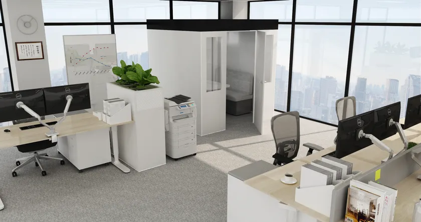 コロナ禍や働き方改革の推進にともなって、働く場所や時間、社内会議やお客様との商談スタイルなどの多様化が急速に進みました。テレビ会議やウェビナーなど新しいビジネス様式が増加したことで、オフィスでは周囲と遮断されたプライベートな空間へのニーズが高まっています。