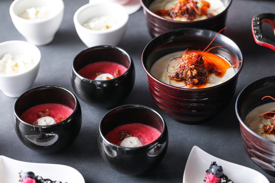 烏賊の炙りとカリフラワーのブランマンジェ(ヴィクトリア)/本日のテリーヌ ベリーとバルサミコのジュレ 銀箔を添えて(マンカストラップ)/南瓜と竹炭パンのスモーブロー仕立て(ラム・タム・タガー)/ビーツとヨーグルトのムース 生ハムと共に(マキャヴィティ)/三河鶏のコンフィ 黒胡麻のソース シャドークィーンのチップと共に(グリザベラ)