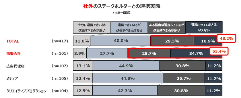 回答者全体の結果では、社外のステークホルダーと「連携できているとはいえない(18.9%)」「ある程度は連携しているが、改善すべき点が多い(29.3%)」と回答した方が、約半数(48.2%)にのぼる結果となりました。特に、事業会社のマーケティング担当者では6割以上(63.4%)を占めています。