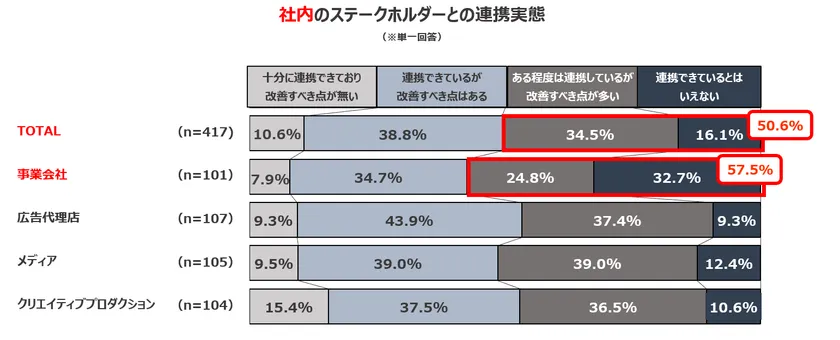 マーケティング・プロモーション業務に従事する417名に、社内外のステークホルダーとの連携実態について調査し、以下の結果を得ました。