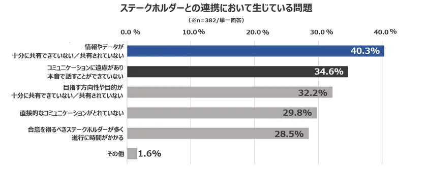 「情報やデータが十分に共有できていない/共有されていない(40.3%)」と、情報共有の不足を挙げる回答者が4割を超え、次いで「コミュニケーションに遠慮があり、本音で話すことができていない(34.6%)」と、コミュニケーションの質を問題点として挙げる回答者が多い結果となりました。