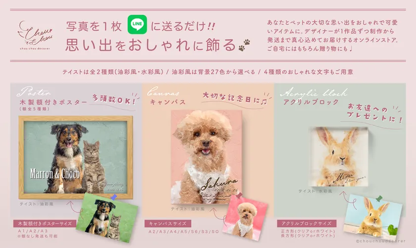 お気に入りのワンちゃん、ネコちゃんの写真を素敵なアートに。 ペット愛好家の為のオンラインアイテムストア 「Chouchou decorer(シュシュデコレ)」がオープン!