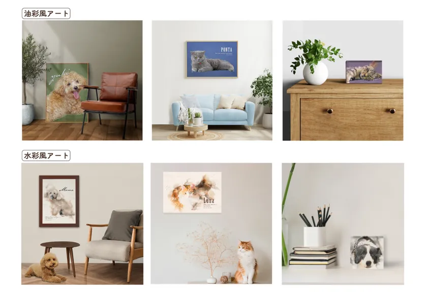 絵画をオーダーするとなるとコスト面でもオーダーの方法でもわからないことだらけで大変なもの。Chouchou decorer(シュシュデコレ)ではお気に入りのペットの写真を1枚送るだけでプロの画家に頼んだかのようなスタイリッシュでオシャレなアートに変身させます。オープン時には需要が高い油彩風と水彩風の2パターンの絵柄をご用意(今後テイストは多数展開予定)。お好きな絵柄でペットを表現することができます。
