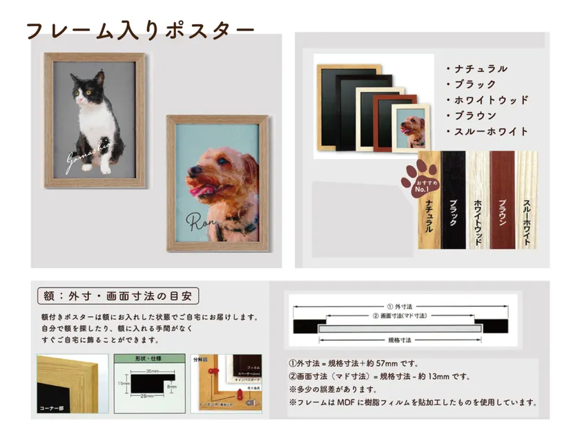 『フレーム入りポスター』は、全3サイズを展開しており、お部屋の雰囲気に合わせてフレームもオーダー時に5種類(ナチュラル・ブラック・ホワイトウッド・ブラウン・スルーホワイト)から選ぶことができます。フレームに入った状態で届くのですぐに飾ることができる商品です。