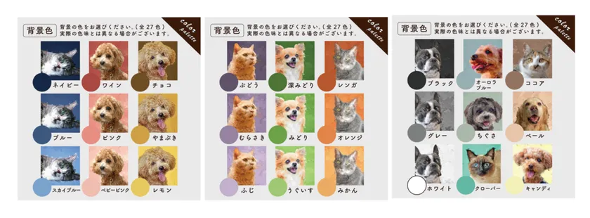 アートの背景となるカラーリングにもこだわりをプラス。カラーは全部で27色展開です。フレームを付けても付けなくてもペットが映えるような背景色を研究し、どんなカラーをチョイスしてもペットとインテリアに馴染むような設計になっています。(現在は油彩風のオーダーのみカラーチョイスが可能となっております)