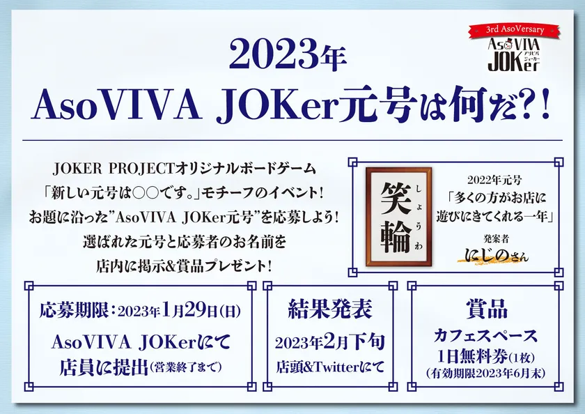 毎年好評の『「AsoVIVA JOKer元号」は何だ?!』というイベントを開催します。オリジナルボードゲーム「新しい元号は〇〇です。」をモチーフとしたイベントで、お題に沿った元号をお客様に考えていただくものです。過去2回の開催時には、たくさん応募をいただく大人気イベントです。