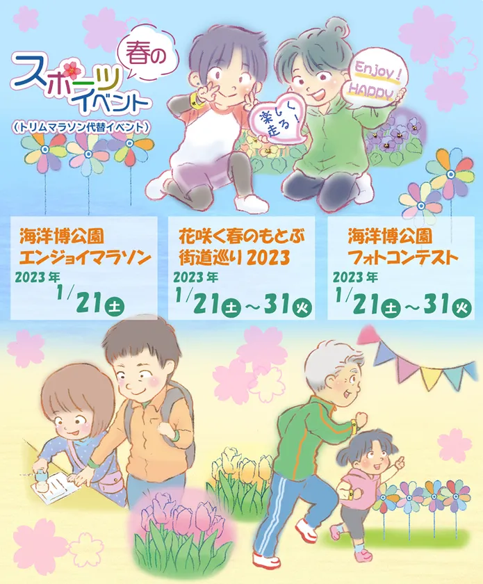 海洋博公園では、2023年1月に開催を予定しておりました「第44回海洋博公園全国トリムマラソン大会」に替わり、気軽に楽しく参加できる春のスポーツイベント「海洋博公園エンジョイマラソン ~同時開催 花咲く春のもとぶ街道巡り2023~」を開催することをお知らせいたします。