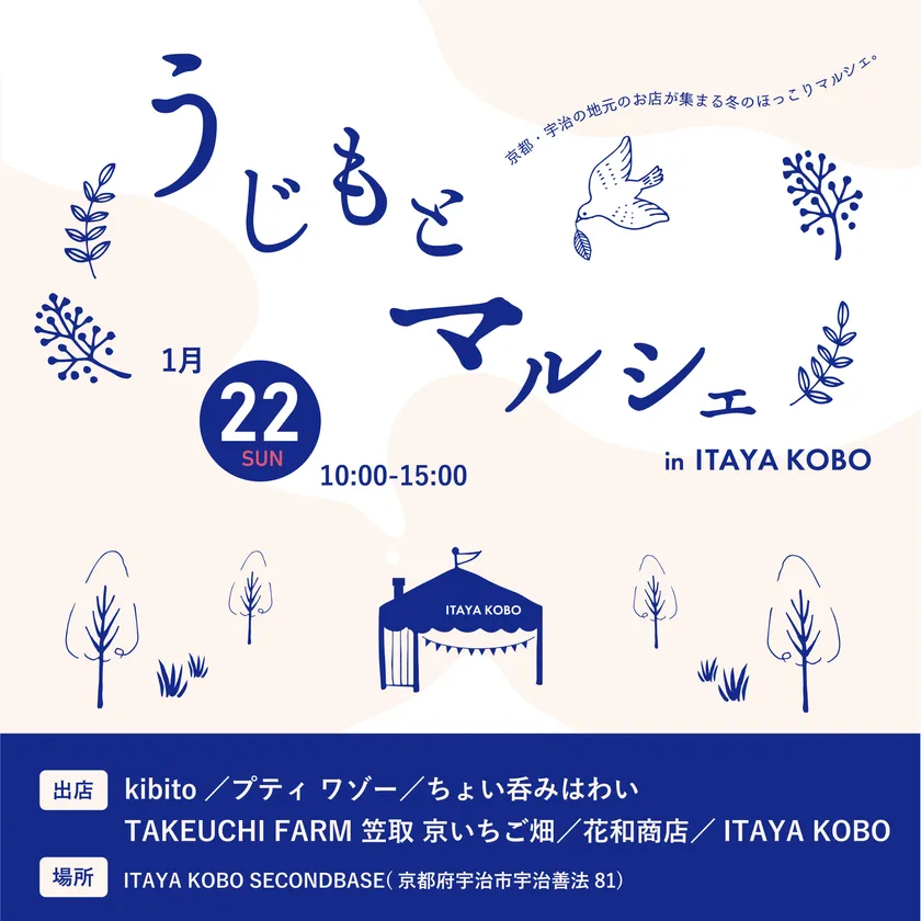 自然素材を使用し住む人に馴染むシンプルな住宅を設計施工するITAYA KOBO(運営:株式会社石巻工務店、所在地:京都府宇治市、代表:石巻 充啓)は、この度、京都・宇治のお店が集う地元宇治ならではのマルシェイベントを2023年1月22日(日)に開催します。