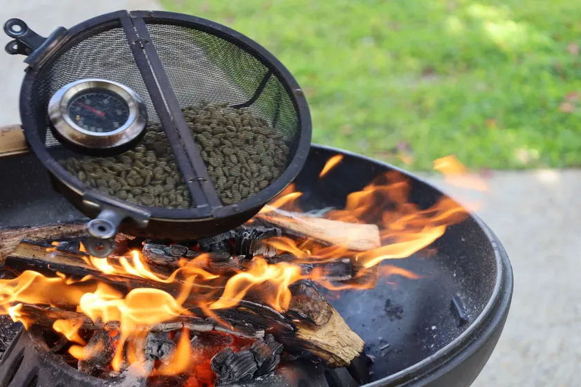 コーヒー生豆を焚き火で直火焙煎して、自分の好みのタイミングで引きあげます。