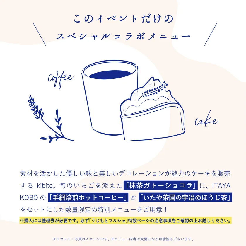宇治の話題の人気店「kibito(ケーキ店)」とITAYA KOBOとのコラボレーションメニューをはじめとし地元飲食店や地元農家の出店、大人から子供まで楽しめるワークショップイベントも開催。