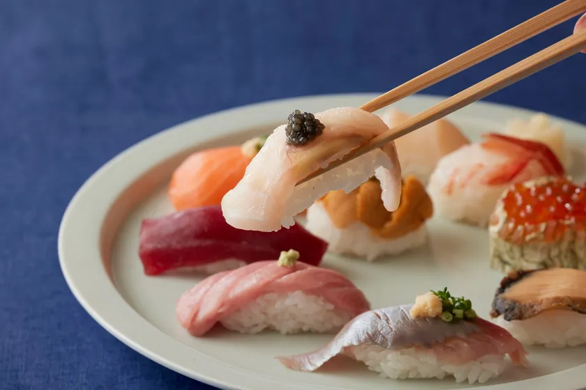 美深町で養殖されたチョウザメとキャビアの贅沢寿司1貫のほか、まぐろやウニも味わえる10貫セット。