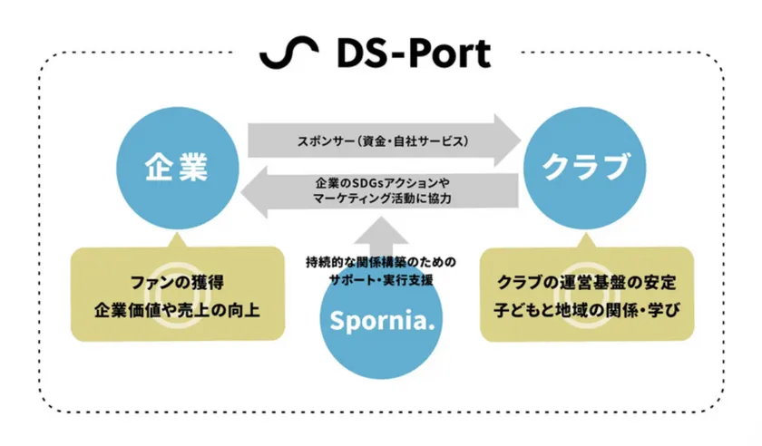 《ローカルスポーツクラブ》は、今、全国的に運営に課題を抱えています。少子化で会員数が減少し、月謝収入のみで運営されるために活動資金も減り、活動の継続が危ぶまれるクラブも少なくありません。一方で飲食店や歯科、整骨院など商圏が数km圏内に限定して活動されている企業は数多く存在します。そうした運営課題を抱える《ローカルスポーツクラブ》と、地域と連携した事業展開や、地域貢献・社会貢献に繋がるアクションを望む《企業》をスポンサーマッチングさせ、双方の経営課題を解決しながら、地域の子供達のスポーツ環境を守るための新事業「DS-Port」がスタートしました。
