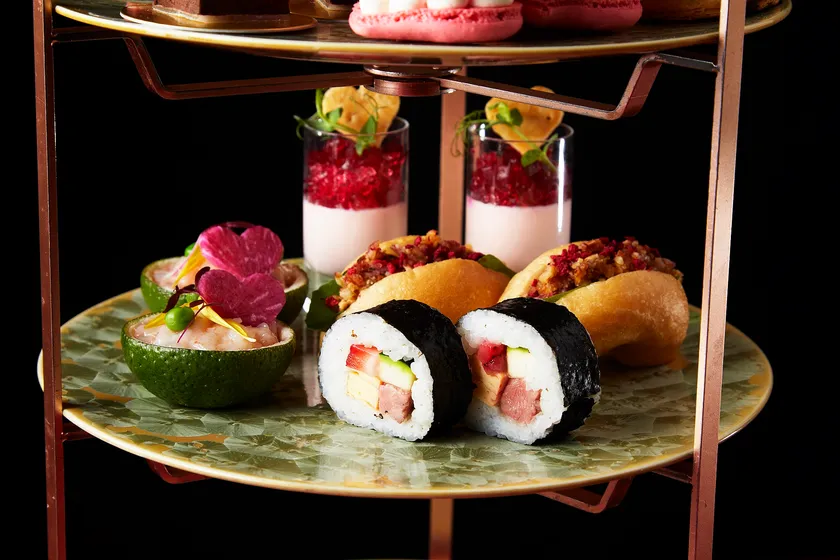 パースニップムースとトリュフ風味のビーツジュレ、甘海老と菜の花のタルタル カボスカップ、クリームチーズとサラミとハニーナッツのベーグルサンドイッチ、ローストビーフと苺の洋風太巻き