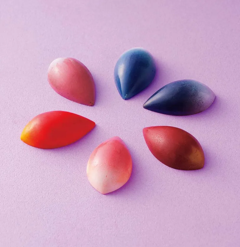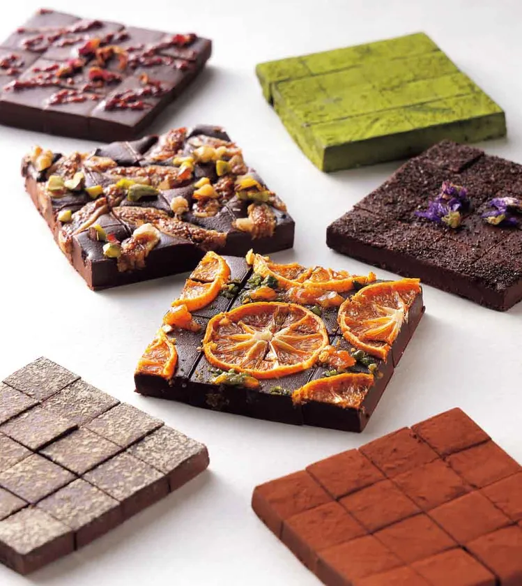 インドネシアのカカオを使用。ホワイトチョコレートを用いた12種の味わいは日本の四季がテーマ。フルーツやお茶など、自然由来の素材で味付け、色付けしたチョコレート。