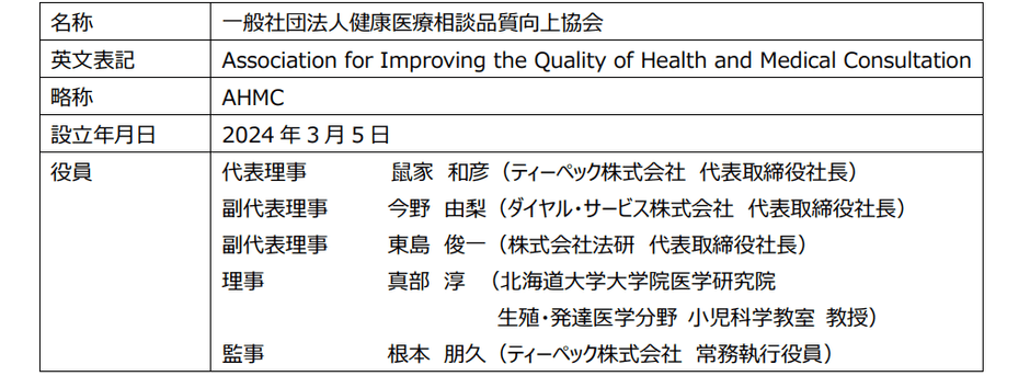 健康医療相談サービスの品質維持と信頼性向上による医療費抑制および健康医療相談業界の継続的な発展を目指して、ティーペック株式会社、ダイヤル・サービス株式会社、株式会社法研で協力し、2024年3月に「一般社団法人健康医療相談品質向上協会」(代表理事:鼠家 和彦、所在地:東京都台東区、略称:AHMC)」を設立し、2024年8月に公式ホームページを公開しました。関連企業の会員募集も積極的に進めていく予定です。