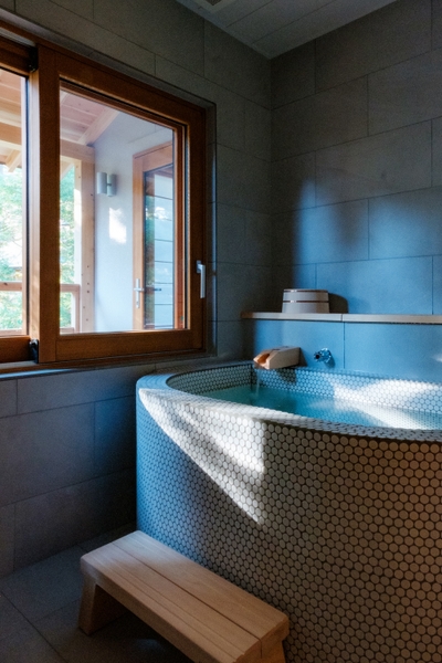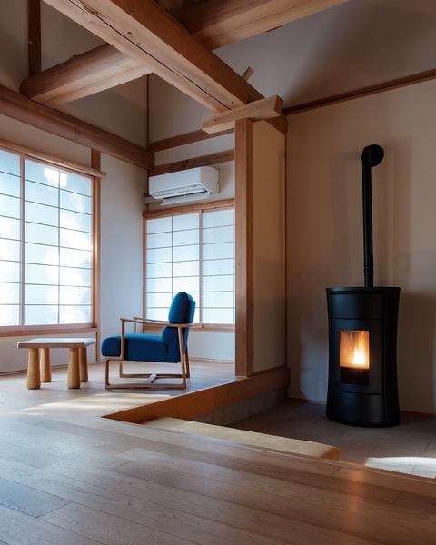 間取りを大きく変更し、温泉は窓付きの内風呂に、土間には間伐材由来ペレットを燃料とするペレットストーブをしつらえました。SDGsの取り組みとして、床暖房の熱源を化石燃料から温泉熱とヒートポンプ利用へと変更し、温泉山荘だいこんの花で化石燃料使用量を50%以上(前年比)削減しました。