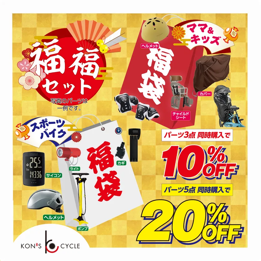 京都・滋賀・大阪を中心に自転車販売店「KON'S CYCLE」17店舗を展開する京都自転車販売株式会社(本社:京都市東山区、代表取締役:近藤 秀樹)は2023年1月3日(火)から1月16日までの期間限定で「新春初売りセール」をKON'S CYCLE全店舗にて実施いたします(一部店舗は1月2日から)。