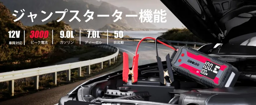 圧倒的なスタートピーク電流3000Aを備え、9.0Lガソリン車と7.0Lディーゼルまでの車わずか数秒間で簡単にエンジンを始動。フル充電の状態で約50回までスターターし、車のバッテリーに接続するだけで、瞬時に車を数回連続に始動させることができます。驚くほど簡単に使え、バイク、電動スクーター、ATV、オフロード、セダン、トラック、商用車など、12V車両に使用可能となっています。