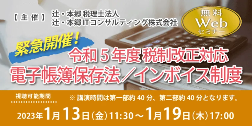 辻・本郷 税理士法人(本社:東京都新宿区、代表社員:徳田 孝司)は、2023年1月13日(金)11時30分~1月19日(木)17時00分の期間中に何度でもご視聴いただけるWEBセミナー「緊急開催!【令和5年度税制改正対応】電子帳簿保存法/インボイス制度」を開催いたします。