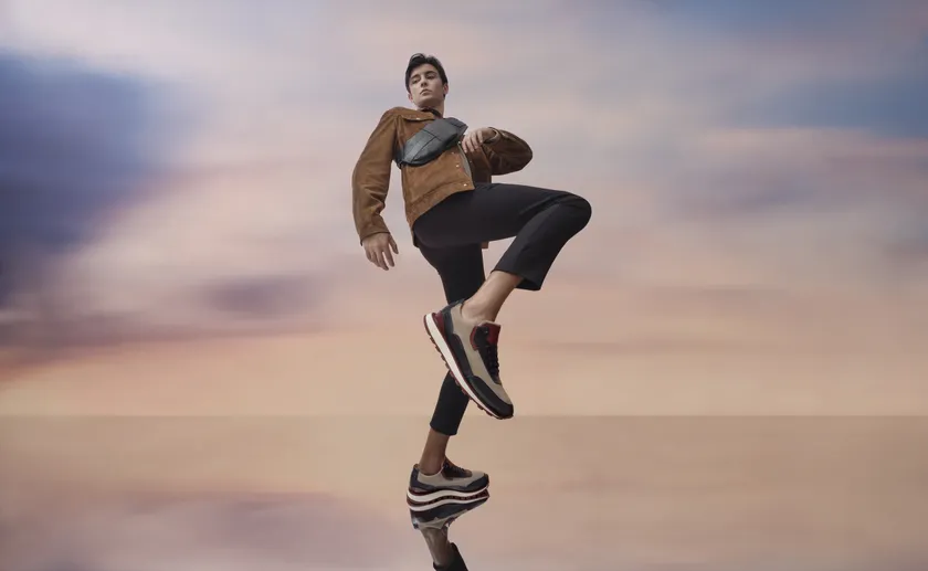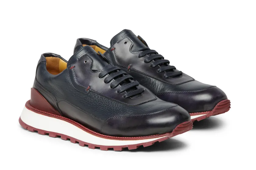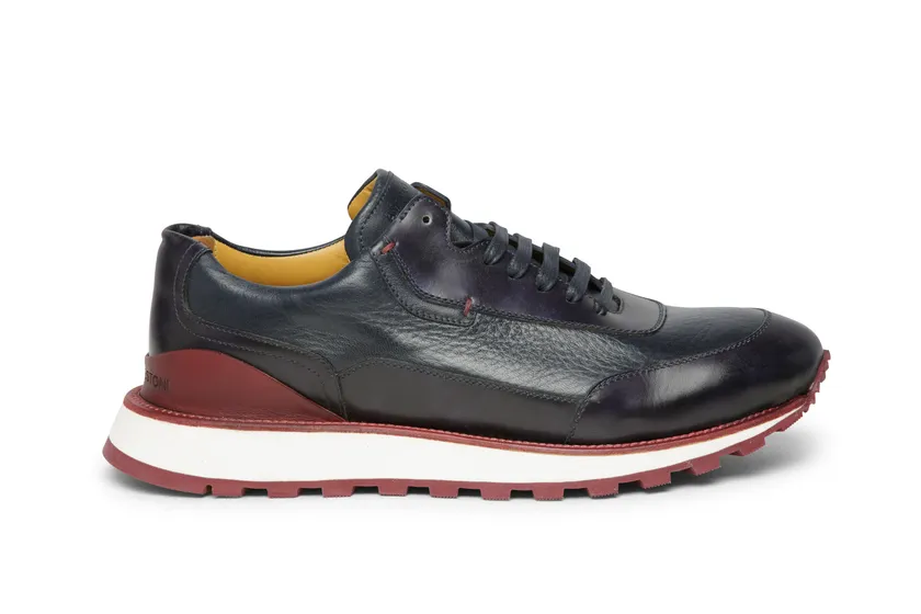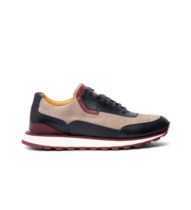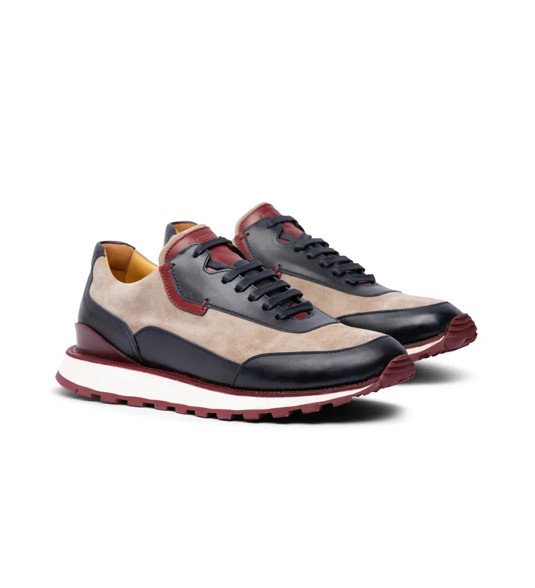 「モエナカーフスキン&スエードスニーカー」は、大胆なカッティングのアンティーク仕上げのカーフスキンと、ベージュ×ネイビー×ボルドーのコントラストカラーのスエードが組み合わされています。このスニーカーは、ボロネーゼ サケット*1で作られており、比類のない快適さと柔軟性を備えています。ホワイトとアメデオ テストーニのアイコンカラーであるランブルスコをミックスしたラバーラグソールを採用しています。インソールには、優れた軽量性を象徴するピウマのアイコンを配し、デザイン性をさらに高めています。