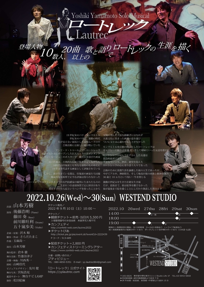 Yoshiki Yamamoto Solo Musical『ロートレック』が2022年10月26日 (水) ~ 10月30日 (日)にウエストエンドスタジオ(東京都中野区)にて上演されます。チケットはカンフェティ(運営:ロングランプランニング株式会社、東京都新宿区、代表取締役:榑松 ⼤剛)にて9月10日(土)より発売開始です。