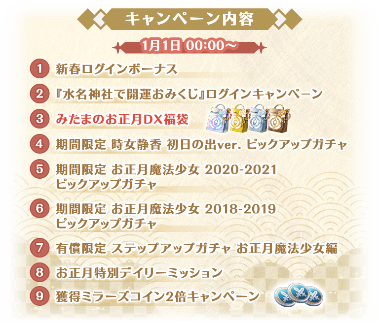 『お正月キャンペーン』では、『期間限定 時女静香 初日の出ver. ピックアップガチャ』と『期間限定 お正月魔法少女2020-2021 ピックアップガチャ 開催』および『期間限定 お正月魔法少女2018-2019 ピックアップガチャ』を開催するほか、お得な期間限定マギアストーンの販売を予定しております。