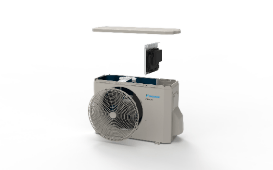 耐久性や施工性、メンテナンス性を高めた東南アジア向けのルームエアコン室外機です。室外機の形状を多角形にすることで強度を高め、リブ加工※1を最小限に抑えたことにより、シンプルでモダンなデザインを実現しました。また、未舗装道路での運搬時にも優れた耐久性を発揮し、従来機種と同等の構造強度を保持しています。さらには、これまで側板にあった持ち手を天板に取り付けたことで、持ち運びやすさが向上し、作業スペースが無い場所での設置が容易になりました。また天板を外すだけで電装部品などの交換が可能となり、安全で効率的なメンテナンスができる構造としています。