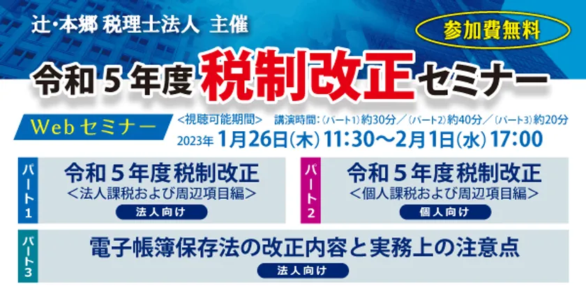 国内最大手税理士法人の辻・本郷 税理士法人が 『令和5年度 税制改正セミナー』を1月26日より無料でWEB開催!