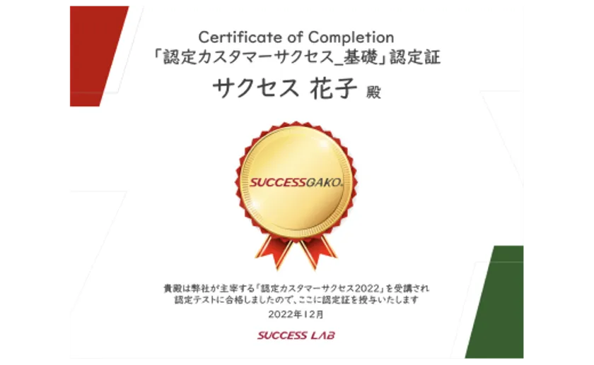 同コースは、動画コンテンツの視聴を中心としたインプットと、復習用のお題に回答するアウトプットの両軸で学習を進めます。動画コンテンツは、カスタマーサクセスの実務経験が豊富なSuccessGAKOの講師陣の知見に基づき、カスタマーサクセスの実践に必要な基礎知識が体系的に網羅された、未経験者でも分かりやすく、かつ効率の良い学習が可能な内容です。すべてのコンテンツを学習し終わった後には「認定テスト」をオンラインで受講していただき、一定の正解率を満たした方には「認定カスタマーサクセス基礎_認定証」を授与します。