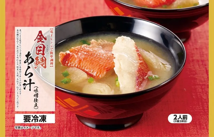 └凍ったまま袋ごと電子レンジで加熱して、簡単に本格的な、豪華なあら汁が楽しめます。金目鯛の旨みと魚の出汁を味わえ、野菜(大根、玉ねぎ、ねぎ)も入ったボリューム感のある一品です。