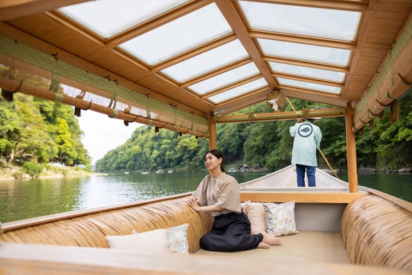 平安貴族が興じた嵐山にたたずむ水辺の私邸で時を忘れる。渡月橋から船に乗り、大堰川を遡った先では、京都に息づく日本の伝統技法を感じる客室、嵐山の情景を映した滋味豊かな日本料理、四季の美しい景観と静けさの非日常が提供されます。