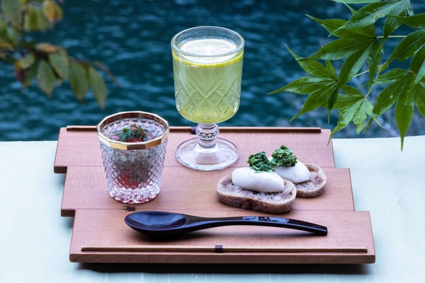 夕食前のアペロには、新茶の風味を楽しめるオリジナルカクテルとおつまみを用意します。新茶のオリジナルカクテルは、新茶の風味を移したジンに酢橘を加え、さっぱりと仕立てました。おつまみは、クリームチーズと花山椒を乗せたほうじ茶カナッペと、玉露が香るトマトのゼリーで楽しむじゅんさいの2品です。