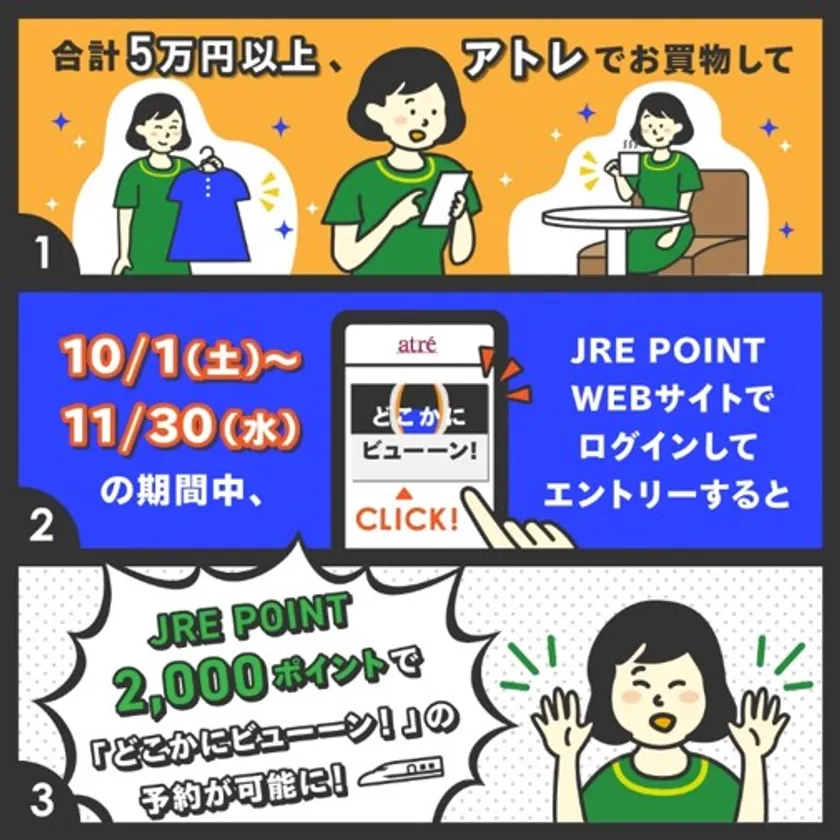 株式会社アトレ(本社:東京都渋谷区、代表取締役社長:一ノ瀬 俊郎)は、東日本旅客鉄道株式会社(以下、JR東日本)と連携し、 2022年10月1日(土)~11月30日(水)の期間中、WEBエントリーの上、対象店舗で合計50,000円(税込)以上お買上の方全員に、JR東日本の新サービス『どこかにビューーン!』が通常より割安にお申込みいただけるクーポン(JRE POINT 6,000ポイント→2,000ポイント)をプレゼントするキャンペーンを実施しました。