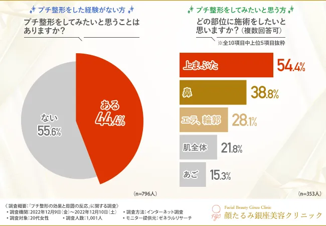 そこで今回、顔たるみ銀座美容クリニック(https://faceup-all-methods.com/)は、20代女性を対象に、「プチ整形の効果と周囲の反応」に関する調査を実施しました。