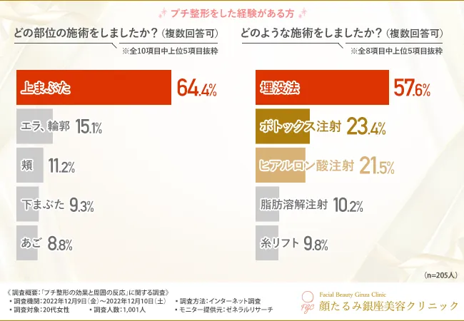先程の調査結果で、プチ整形経験者の施術した部位や施術方法が明らかになりました。